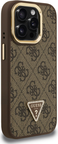 Guess PU 4G Strass Triangle Logo Stand Camera Frame MagSafe Case Aizsargapvalks priekš iPhone 15 Pro Max / brūns