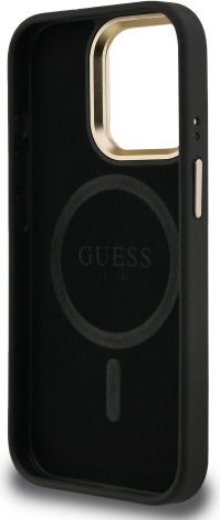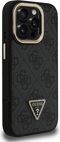 Guess PU 4G Strass Triangle Logo Stand Camera Frame MagSafe Case Aizsargapvalks priekš iPhone 15 Pro Max / melns