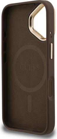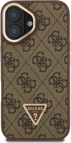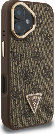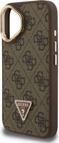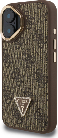 Guess PU 4G Strass Triangle Logo Stand Camera Frame MagSafe Case Aizsargapvalks priekš iPhone 16 / brūns