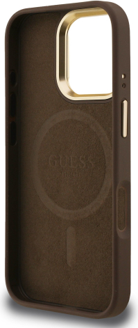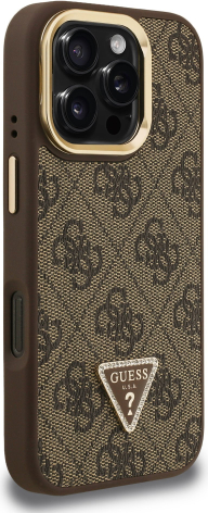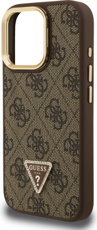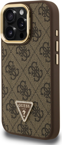 Guess PU 4G Strass Triangle Logo Stand Camera Frame MagSafe Case Aizsargapvalks priekš iPhone 16 Pro Max / brūns