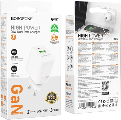 1. Material: PC flame retardant material2. Output: USB-C: 20W (PD/QC/FCC/AFC);USB-A:18W(QC/FCP/AFC); USB-C+USB-A=5V/3A3. European standard pins EU4. Size: 80.5 * 40 * 28mm; Weight: 51g