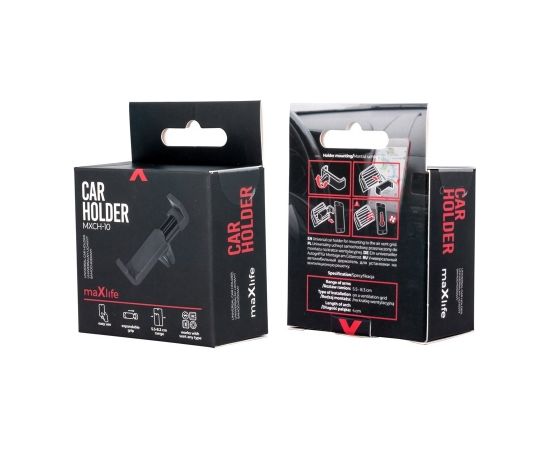 | Maxlife MXCH-10 automašīnas turētājs. Produkts ir uzstādīts uz ventilācijas režģa, kas pozitīvi ietekmē braukšanas komfortu. Turklāt tas der gandrīz visām restēm, un to montāža un demontāža ir ļoti vienkārša. Rokturis der daudzu veidu ierīcēm un netraucē tālruņa uzlādi.