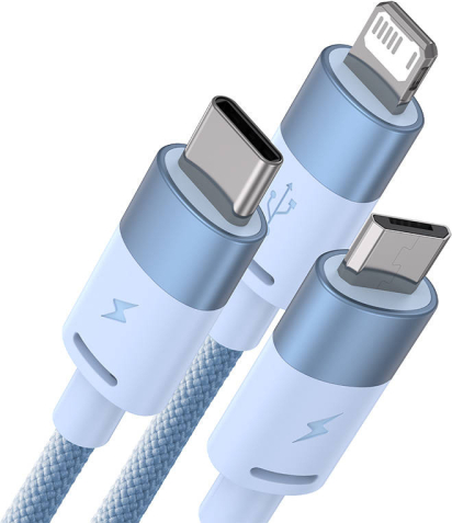 Baseus StarSpeed 3-in-1 USB cable, USB-C + micro USB + Lightning, 3.5A, 1.2m (blue)One cable, many possibilities. The Baseus StarSped cable allows you to charge as many as 3 devices at the same time. USB-C, micro USB and Lightning connectors make the cable compatible with a range of equipment. It supports high-speed charging of 5V / 3.5A and enables data transfer speeds of up to 480 Mbps. It provides a high level of safety during use. It also stands out for its durability and resistance to damage.