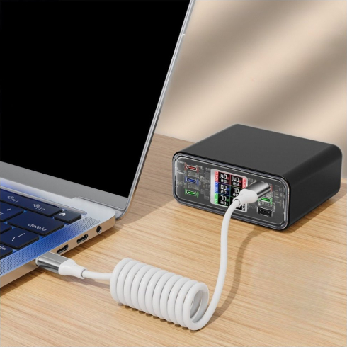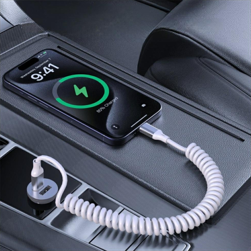 Šis kompaktais un elastīgais USB-C uz USB-C kabelis nodrošina ātru datu pārraidi līdz 480 Mbps un atbalsta ātru uzlādi līdz 100 W, padarot to piemērotu viedtālruņiem, planšetdatoriem un portatīvajiem datoriem. Spirālveida dizains ļauj izmantot kabeli automašīnā vai šaurās vietās – tas izstiepjas līdz 50 cm un saraujas līdz 12 cm, kad netiek lietots. Tehniskie parametri: