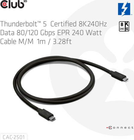 Thunderbolt™ 5 Certified 8K240Hz Data 80/120 Gbps EPR 240 Watt Cable M/M 1m / 3.28ft Manufacturer Website: https://www.club-3d.com/en/detail/2677/thunderboltt_5_certified_8k240hz_data_80-120_gbps_epr_240_watt_cable_m-m_1m_-_3.28ft/ | ||||||||||||||||||||||||||||||||