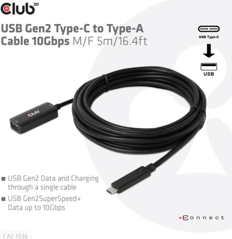USB Gen2 Type-C to Type-A Cable 10Gbps M/F 5m/16.4ft Manufacturer Website: https://www.club-3d.com/en/detail/2579/usb_gen2_type_c_to_type_a_cable_10gbps_m-f_5m-16.4ft/ | ||||||||||||||||||||||||||||||