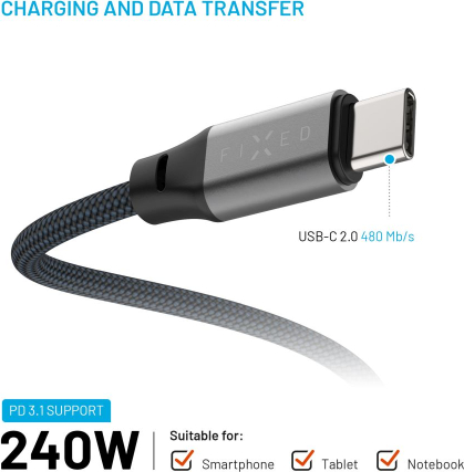 Fixed Magnetic Braided Cable USB-C/USB-C, USB 2.0, Gray FIXDBM-CC2-GR