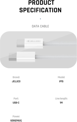 Ražotājs: Jellico Garums: 1m Krāsa: Balta Savienojums: USB-C (Type-C)uzUSB-C (Type-C) Šis USB-C (Type-C)kabelis nodrošina ātrdarbīgas USBс 3.0 erīces datu pārraides ātrumu un vienlaikus uzlādē tālruni, izmantojot USB portu. SAVIETOJAMĪBA - UNIVERSĀLS - Savietojams ar visiem mobīlajiem telefoniem un iekārtām, kuras atbalsa vienotoUSB-C (Type-C) - USB-C (Type-C)datu un uzlādes savienojumu! Ieteicams : iPhone 15 un iPhone 16 sērijas mobīlajiem telefoniem, kā arī jaunākajiem iPad planšetdatoru modeļiem ātrās uzlādes nodrošinājumam. Jellico IP15 -Sērija ir atšķirīga ar īpaši izturīgu vada materiālu kas iz veidots no pīta auduma ar PVC konektora. Pateicoties šaj vada tehnologjai, tas ir īpaši izturīgs pret sapīšanos un plīsumiem, kā arī tā virsma ir patīkama un neparasta pielietošanā! IP15 sērijas vadiem ir noturīgs vada pinums un PVC konektori kas pasarkā tos no lūzuma. IP15 nodrošina līdz pat 66W strāvas ātro uzlādi, kas ir perfekti domāta jaunajiem iPhone 15 un iPhone 16 sērijas mobīlajiem telefoniem, kā arī ir savietojami ar jebkura cita ražotāja telefonu, planšetdatoru un citu viedo iekārtu kura izmmanto USB-C konektora uzlādi. 1. Cinka sakausējuma apvalks. Delikāts dizains. Augstākās klases augstākās klases. 2. Augstas šūpoles dizains. 30 000 reižu lieces tests, lieces pretestība un izturība. 3. Stingra pīta līnija, nav viegli nolietojama un mezgli, ļoti izturīga. Tehniskie parametri: