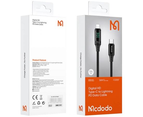 Mcdodo CA-1030 USB-C to Lightning cable, 36W, 1.2m (black)With the Mcdodo cable, you can instantly renew your device's power and transfer files. It is compatible with all models of Apple smartphones and tablets. What's more, the built-in LED screen displays the charging power, and the use of high-quality materials ensures durability against damage. In addition, the Velcro attached to the cable makes it easy to store the product.