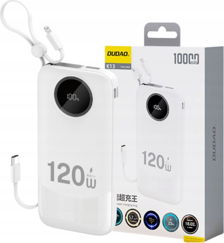 Dudao 120W fast charge built-in cable digital display 10000mAh White