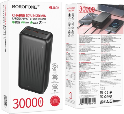 1. Capacity: 30000mAh 111WhCapacity: 16500mAh2. Input: USB-C/Micro USB: 18W3. Output: USB-A1/A2:22.5W (QC/FCP/SCP/AFC) USB-C: 20W (PD/QC/FCP/AFC) Total output: 5V/2A4. Indication: LED indicator of battery charge level.5. Material: ABS+PC+polymer electronics6. Size: 146*69*40mm Weight: 605 grams