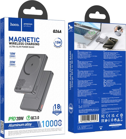 1. Capacity: 10000mAh 38.7Wh Rated capacity: 6000mAh2. Input: Type-C: 18W3. Output: Type-C: 20W (PD/QC/FCP/AFC), Wireless charging output: 5W/7.5W/10W/15W (MagSafe 7.5W), Total output: 5V/2A4. Display: LED light shows the power level5. Material: aluminum alloy shell + lithium polymer cell6. Size: 102*67*13.5mm, Weight: 171g