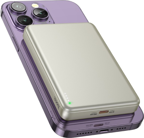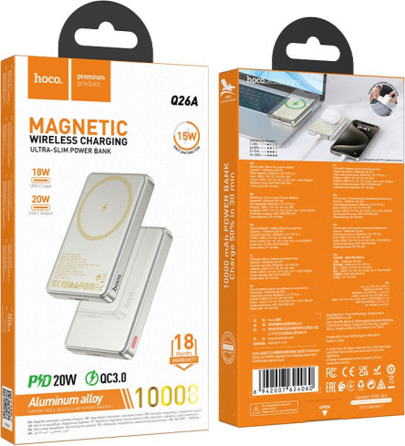 1. Capacity: 10000mAh 38.7Wh Rated capacity: 6000mAh2. Input: Type-C: 18W3. Output: Type-C: 20W (PD/QC/FCP/AFC), Wireless charging output: 5W/7.5W/10W/15W (MagSafe 7.5W), Total output: 5V/2A4. Display: LED light shows the power level5. Material: aluminum alloy shell + lithium polymer cell6. Size: 102*67*13.5mm, Weight: 171g