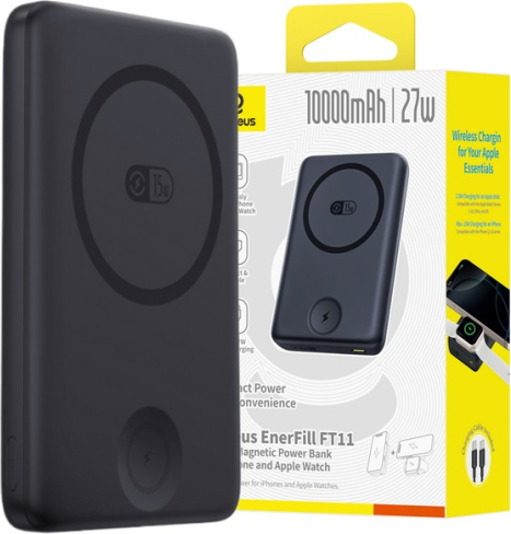 LiPo PowerBank 10000mAh 27W bezvadu QI + iWatch, ar magnētu Magsafe melns EnerFill FR11 BASEUS