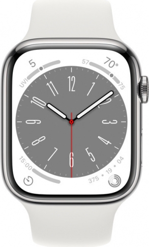 Apple Watch 8 GPS + Cellular 45mm Stainless Steel Sport Band, silver/white (MNKE3EL/A)