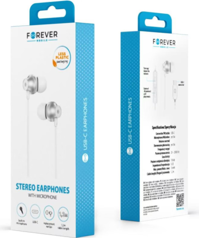 Forever ausīs ievietojamās austiņas apvieno mūsdienīgu tehnoloģiju un komfortu. Ar USB-C savienotāju tās nodrošina plašu savietojamību ar mūsdienīgām ierīcēm, piemēram, viedtālruņiem, planšetdatoriem un klēpjdatoriem. |