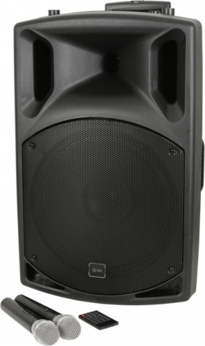The QTX QX15PA-Plus 15" PA Speaker With Wireless Microphones is a complete portable PA unit ideal for mobile vocal applications. The QX15PA-Plus offers 100-watts of continuous output and can be operated via a mains power supply or rechargeable battery. An integrated media player features USB/SD/FM connections and there is also a Bluetooth receiver for wireless audio streaming. There are 2 x mic inputs, an auxiliary line input and wireless receiver for use with the included microphones. The cabinet features an integrated carry handle and retractable trolley handle for easy transport, and a pole mount insert for installation purposes.