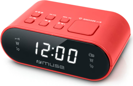 | Divu modinātāju pulksteņa radio PLL, 3 V, M 10 RED, MUSE. 0,6 collu balts LED displejs. 24 stundu pulkstenis. Spilgtuma regulators (augsts / zems / izslēgts). PLL radio ar 20 FM iepriekš iestatītām stacijām. Manuāla noskaņošana un iepriekš iestatīto staciju saglabāšana. Modināšana ar radio vai skaņas signālu. Atlikšanas (snooze) un miega (sleep) funkcijas. Barošana: AC 230 V ~ 50 Hz. Rezerves barošana: 3 V Power Logo 2×1,5 V “AAA”/UM4/R03 tipa baterijas (nav iekļautas). 45 mm (A) × 70 mm (P) × 120 mm (G). |