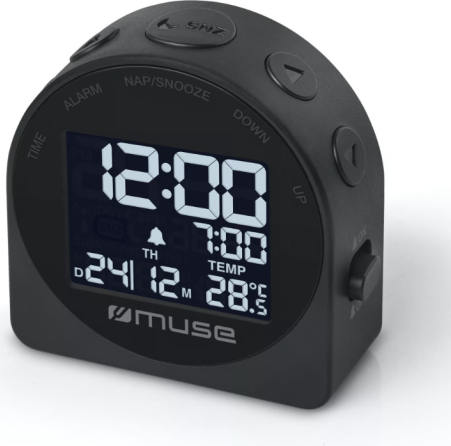 | Pārnēsājams pulkstenis, 2×1,5 V, M 09 C, MUSE. Atlikšanas (snooze) un snaudas (nap) funkcija. Viens modinātājs ar skaņas signālu, LCD displejs ar baltu apgaismojumu. 12 vai 24 stundu laika attēlojums. Temperatūras un kalendāra attēlojums. Barošana: DC 2×1,5 V Power Logo AAA/R03/UM4 tipa baterijas (iekļautas). 62 mm (A) × 25 mm (P) × 62 mm (G). |