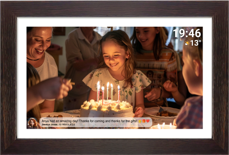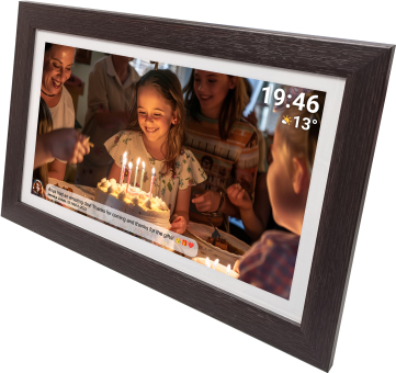 Viedais 15,6 collu Wi-Fi foto rāmis ar IPS skārienekrānu un 16 GB zibatmiņu (eMMC) Iepriekš instalēta FRAMEO programmatūra, kas ļauj veikt personiskas foto rāmja funkcijas Lejupielādējiet lietotni savā viedtālrunī un pēc tam pārsūtiet fotoattēlus un videoklipus uz FRAMEO fotorāmīti Pievienojiet attēliem tekstu Koka rāmis 15,6” FULL HD IPS skārienekrāns ar izšķirtspēju: 1920x1080 Iestatiet attēlu pagriešanas laiku no 10 sekundēm līdz 30 minūtēm Taimera funkcija, lai FRAMEO foto rāmis naktī automātiski izslēgtos Tehniskie dati Strāvas padeve: 230V ~ 50Hz AC/DC adapteris Failu tipi: JPEG fotoattēli un video no viedtālruņa Savienojumi: MicroUSB ieeja (strāvas padevei), MicroSD kartes slots Atmiņa RAM: 1 GB Atmiņa: 16GB iekšējā atmiņa + MicroSD kartes slots attēlu importēšanai no MicroSD kartes Programmatūra: Frameo programmatūra fotorāmī, bezmaksas lietotne Android un iOS ierīcēm Wi-Fi: iebūvēta Wi-Fi funkcija