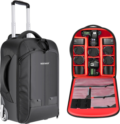 Neewer NW3300 Camera Backpack (Red)The Neewer NW3300 offers creatives reliable protection for their gear while traveling. Thanks to its 2-in-1 design, it can act as a backpack or a wheeled suitcase, and its dimensions of 55 × 35 × 26 cm make it fit into most carry-on luggage compartments. In addition, 11 adjustable compartments, 4 small pockets and 4 mesh pockets make it easy to organize your space. It's a practical solution for photographers and filmmakers who need to easily transport a complete shooting kit.