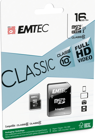 microSD Class10 Classic Emtec populārās microSD kartes par vislabāko cenu! Funkcijas Ideāli piemērotas ikdienas lietošanai un lietotājiem, kuri meklē standarta veiktspēju par pieņemamu cenu. Lasīšanas ātrums līdz 20 MB/s Rakstīšanas ātrums līdz 12 MB/s Tehniskā specifikācija Ietilpība: 16 GB Klasifikācija: Class 10 Lasīšanas ātrums: līdz 20 MB/s * Rakstīšanas ātrums: līdz 12 MB/s * Sertifikācija: CE / REACH / RoHS / FCC / ICES / RCM Temperatūra: darbības režīmā -25 °C līdz 85 °C / uzglabāšana -25 °C līdz 85 °C Svarīgi: Balstīts uz iekšējiem testiem. Veiktspēja var atšķirties atkarībā no lietošanas un ierīces.