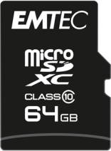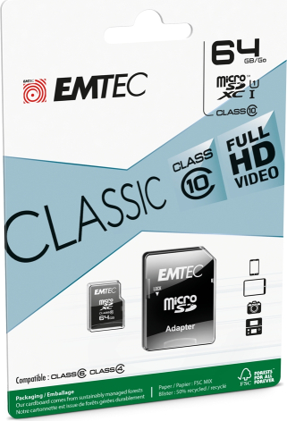 microSD Class10 Classic Emtec populārās microSD kartes par vislabāko cenu! Funkcijas Ideāli piemērotas ikdienas lietošanai un lietotājiem, kuri meklē standarta veiktspēju par pieņemamu cenu. Lasīšanas ātrums līdz 20 MB/s Rakstīšanas ātrums līdz 12 MB/s Tehniskā specifikācija Ietilpība: 64 GB Klasifikācija: Class 10 Lasīšanas ātrums: līdz 20 MB/s * Rakstīšanas ātrums: līdz 12 MB/s * Sertifikācija: CE / REACH / RoHS / FCC / ICES / RCM Temperatūra: darbības režīmā -25 °C līdz 85 °C / uzglabāšana -25 °C līdz 85 °C Svarīgi: Balstīts uz iekšējiem testiem. Veiktspēja var atšķirties atkarībā no lietošanas un ierīces.