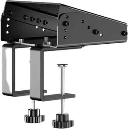 Set: steering wheel, base, pedals and clamp lying on black platforms.