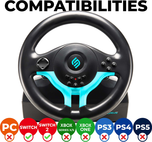 Stūre arkādes spēlēm, atklāj pirmās sacīkšu simulācijas sajūtas. Funkcijas • Vairāku saderīgu 3 spieķu vadu stūre • Rotācijas leņķis: 180 grādi. • Stūres diametrs: 22 cm. • Pedāļi un stūre. • Dubultās vibrācijas motors • Savietojamība: PS4, PS3, XBOX ONE, personālais dators, SWITCH