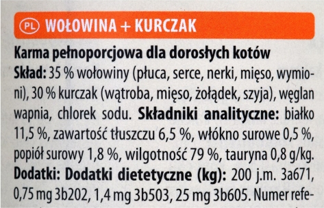 Pet food composition Beef 35% (lungs, heart, meat, kidneys, udder), chicken 30% (liver, meat, stomach, throat), calcium carbonate