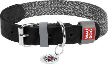 | Dog collar in natural leather and recycled material with QR code Waudog size S, width 15 mm (black).WAUDOG collar is a combination of natural leather and recycled cotton, designed for the comfort of small dogs. Perfect for pets with a neck circumference of 27 cm to 36 cm, it provides a perfect fit and comfort during daily walks. With a width of 15 mm, the collar is light and gentle, yet sturdy enough to meet the needs of small breeds.