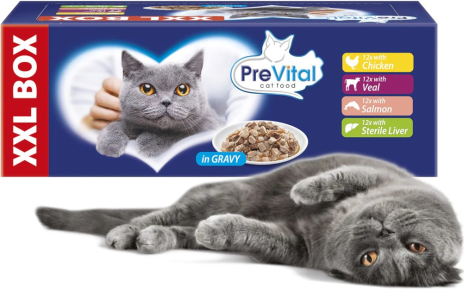 PREVITAL XXL BOX Flavor Mix with Chicken, Veal, Salmon, and Liver in Gravy - Wet Cat Food - 48 x 100g