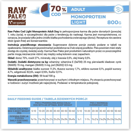 VetExpert Raw Paleo Dorsz/Cod Light Adult Can 800g