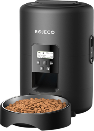 Rojeco automatic food dispenser 2 lProvide your pet with healthy, tasty food at set times. Rojeco's 2L automatic food dispenser combines scheduling 1-4 meals per day, precise portioning (1-40 servings of 10g each), a hygienic 304 stainless steel bowl, two power options, and convenient push-button and LED screen operation. The anti-jamming system ensures smooth feeding, and the removable design makes it easy to clean.